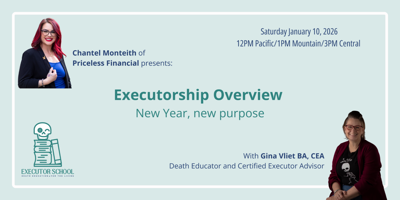 With over 20 years in leadership, certification as an Executor Advisor, education in funeral services, and experience as an instructional designer and facilitator, she takes a practical and fun approach to helping you acknowledge your mortality and plan for your inevitable demise.